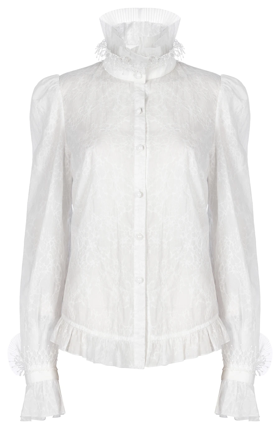 Col remontant en tissu plissé orné de broderies et de fine dentelle