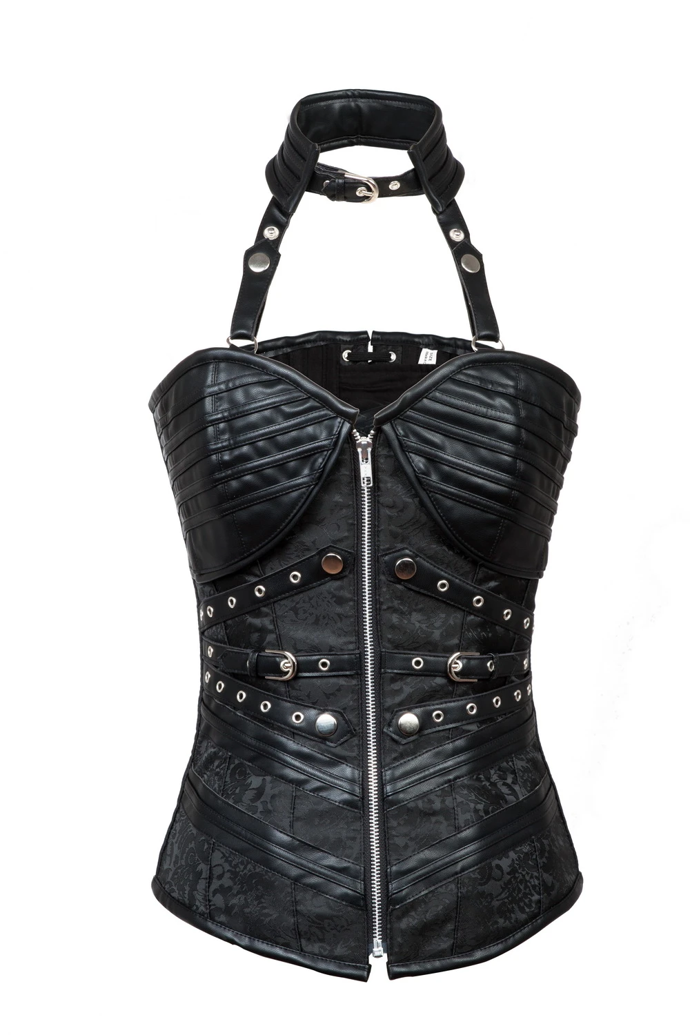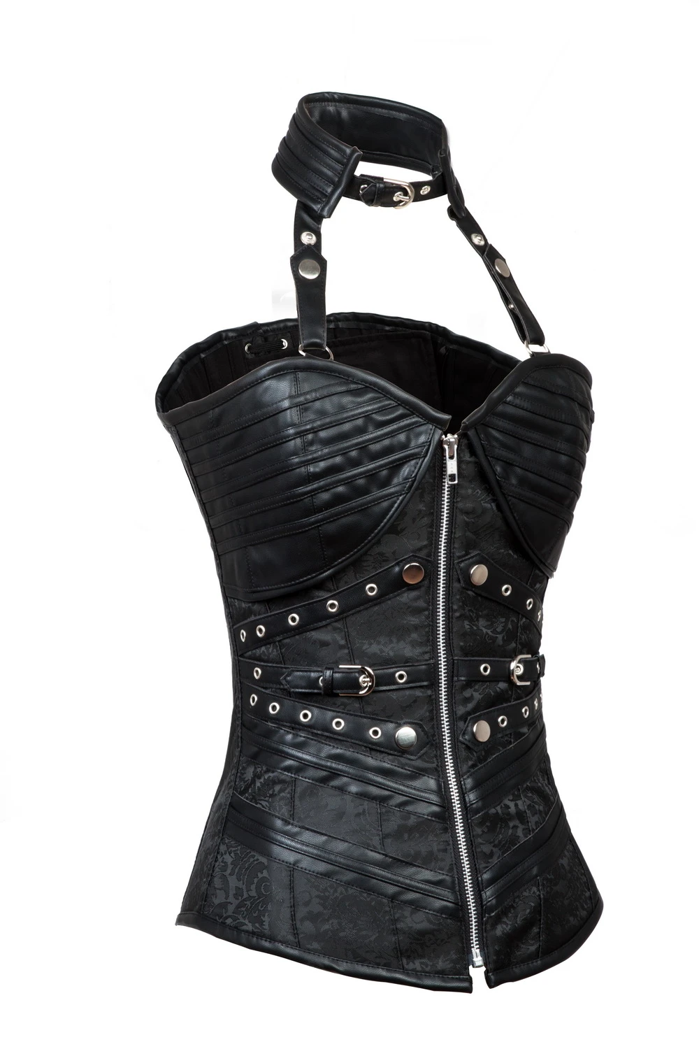 La poitrine est agrĂ©mentĂ©e de simili cuir donnant l’effet d’une poitrine prĂ©formĂ©e, le tour de cour rattachĂ© et amovible accentue encore un peu plus le style trĂšs rock de ce modĂšle.