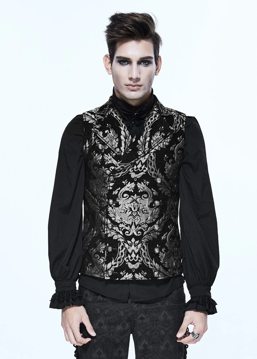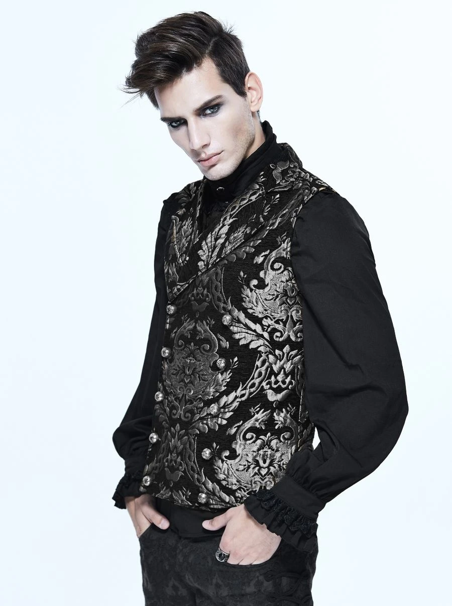 Ce gilet noir de style royaliste est décoré de supers motifs baroques gris, il possède de beaux boutons argentés