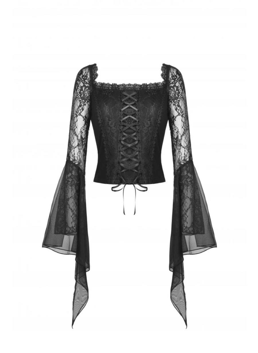 Il possède de grandes manches médiévales en dentelle avec ajout de tulle très fin