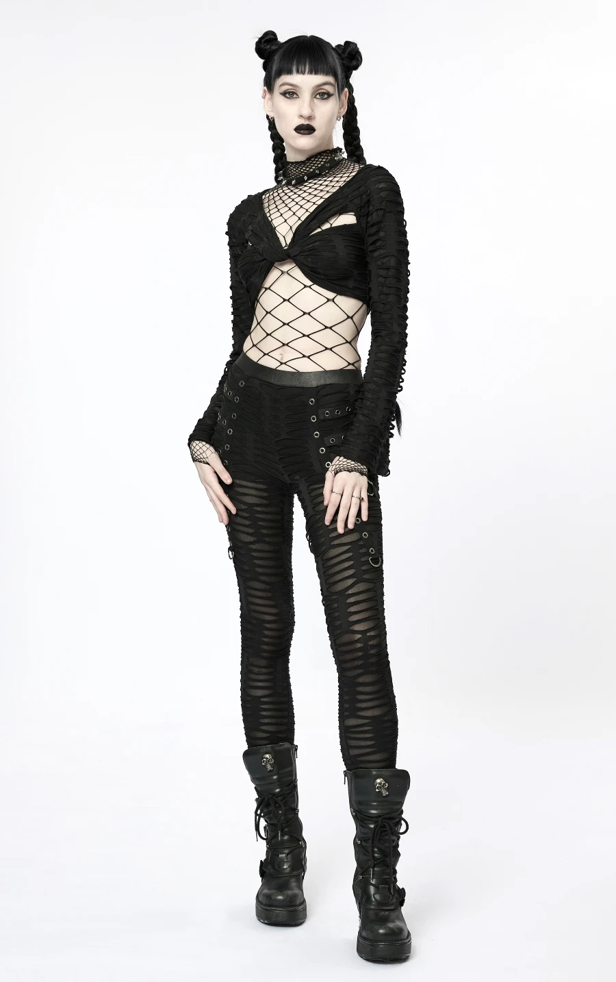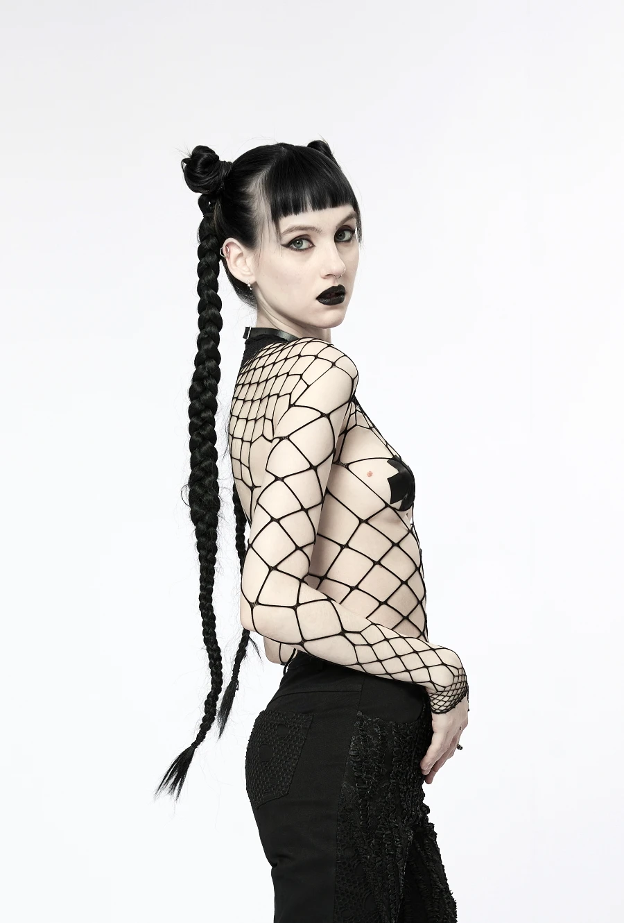 Ce haut manches longues signé Punk Rave est fabriqué en tissu mesh (résille) à mailles très extensibles