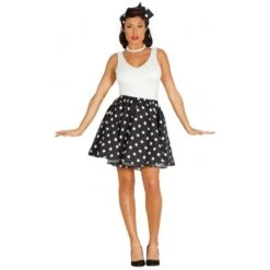 Pour compléter votre tenue, faites simple avec un débardeur blanc en haut. Il est possible d’utiliser quelques accessoires comme un collier de perles, des collants, des bracelets à perles, une paire de lunettes, des boucles d’oreilles, des gants ou encore une perruque pour ressembler parfaitement à une personne des années 50.