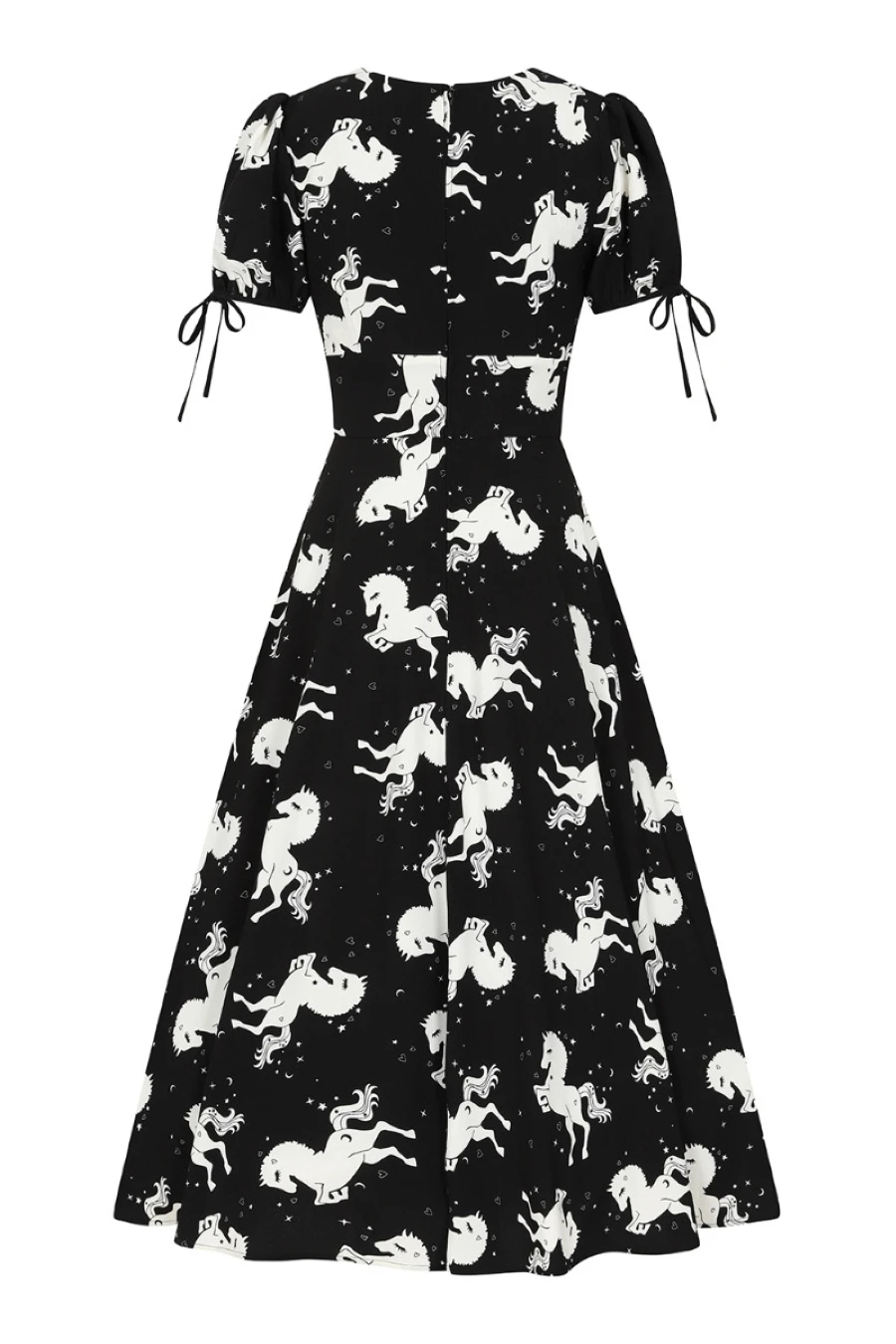 Cette belle robe noire signée Hell Bunny possède un imprimé de licornes dans un pur esprit Fantasy
