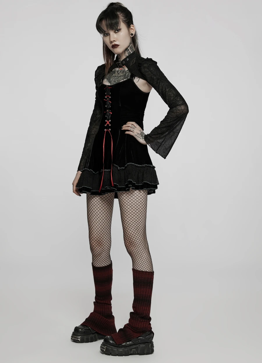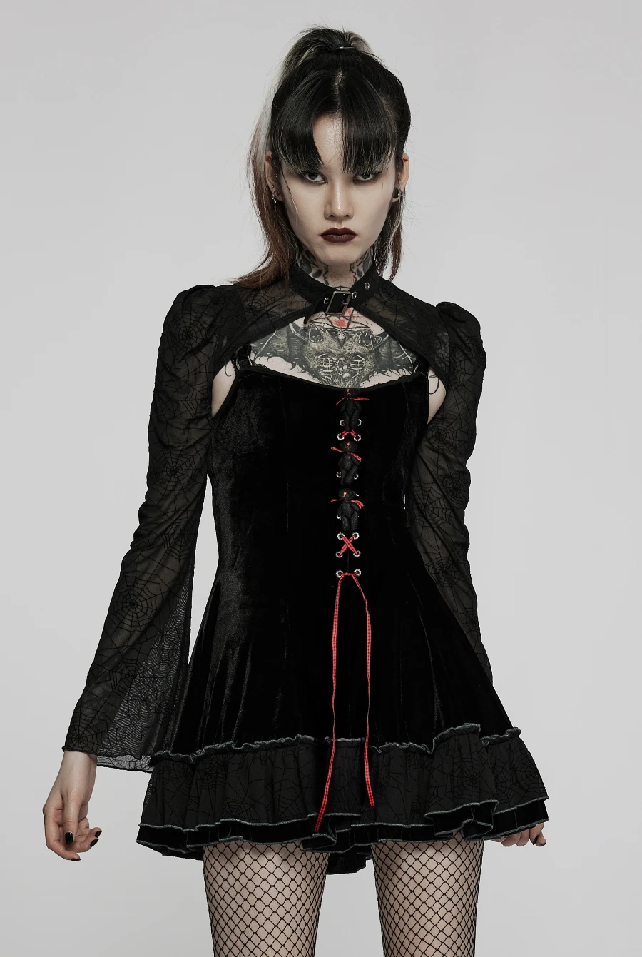 Magnifique ensemble composé de la robe en velours noir et du boléro en tissu résille araignée
