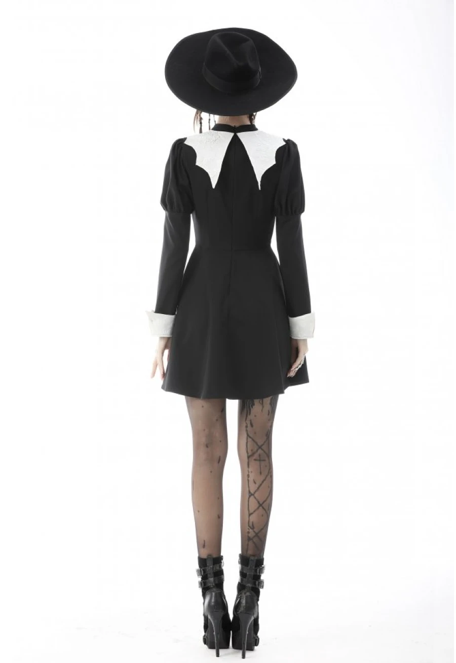 Elle possède un grand col blanc exagéré avec découpe type chauve-souris