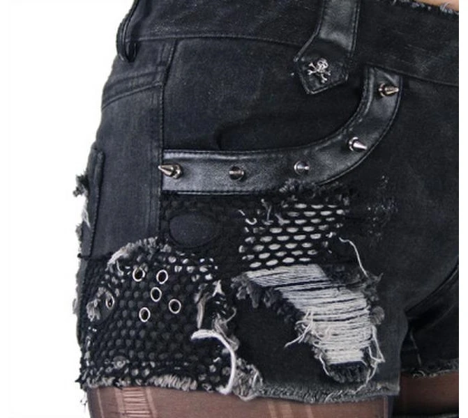 Short gothique femme en jean gris délavé avec effets déchirés, il est orné de clous pointus, d’une petite chaîne et de pièces de tissu filet