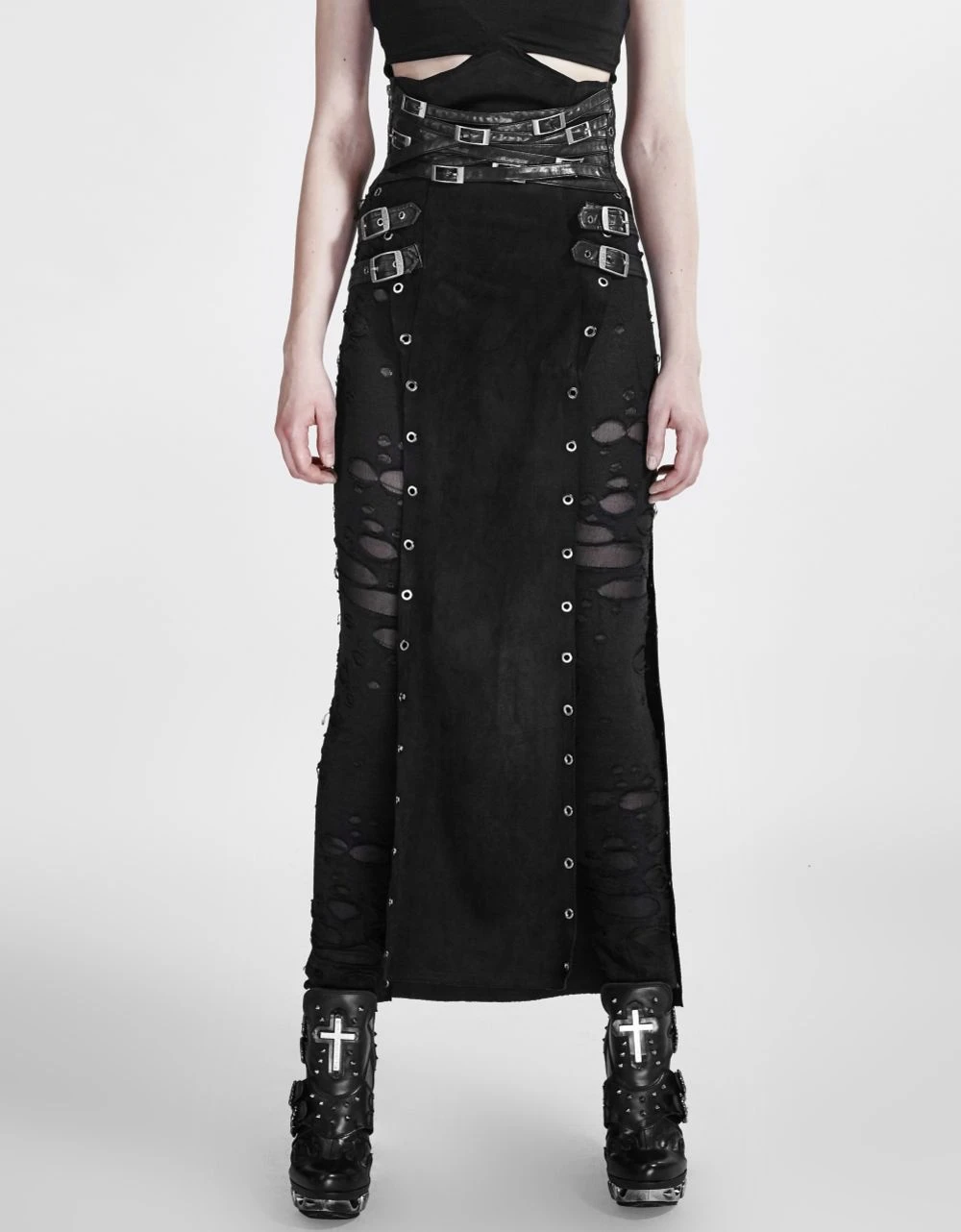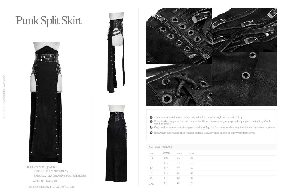 Elle est décorée de sangles en simili cuir sur le haut donnant l’effet d’une multitude de ceintures, les côtés sont ouvert et agrémentés d’oeillets métalliques